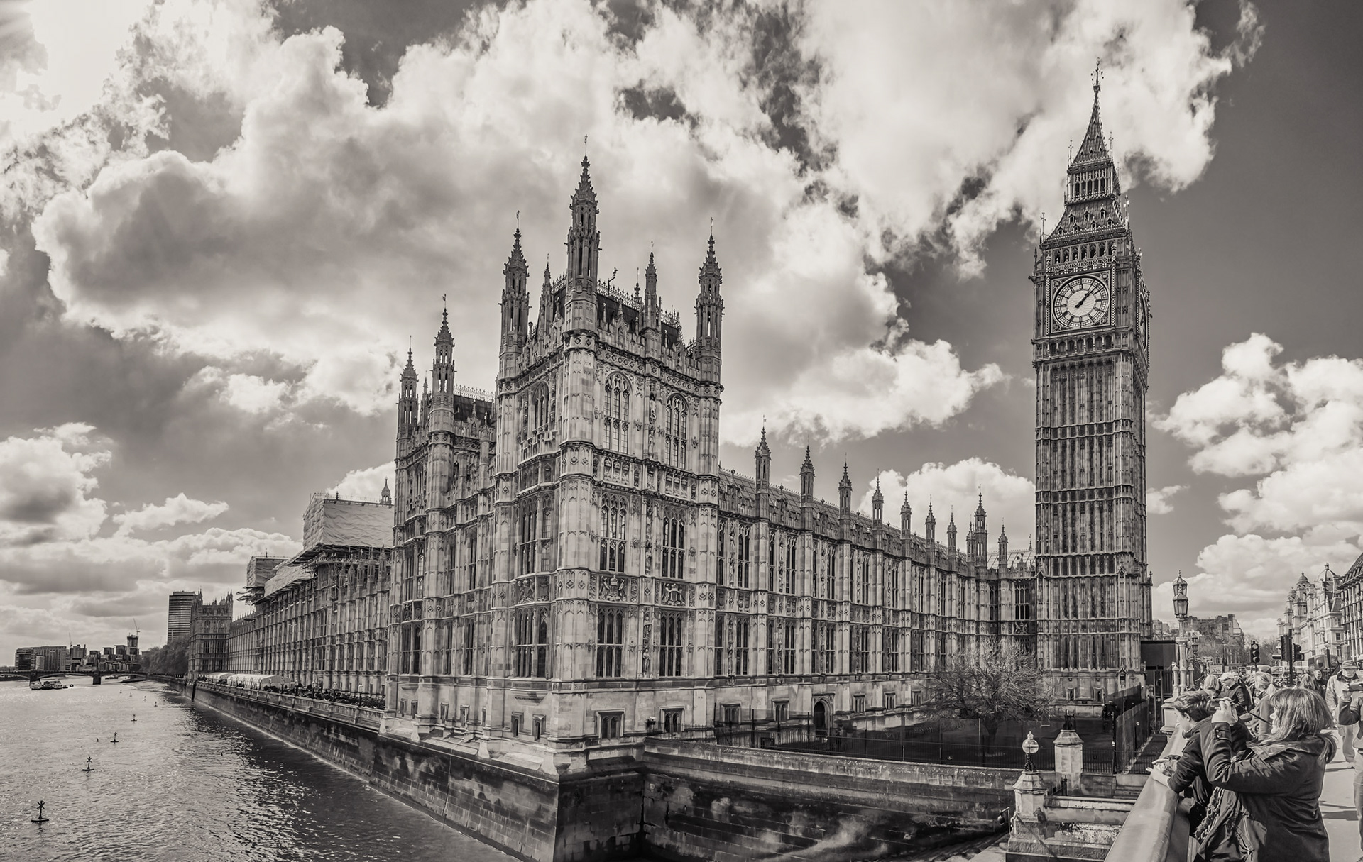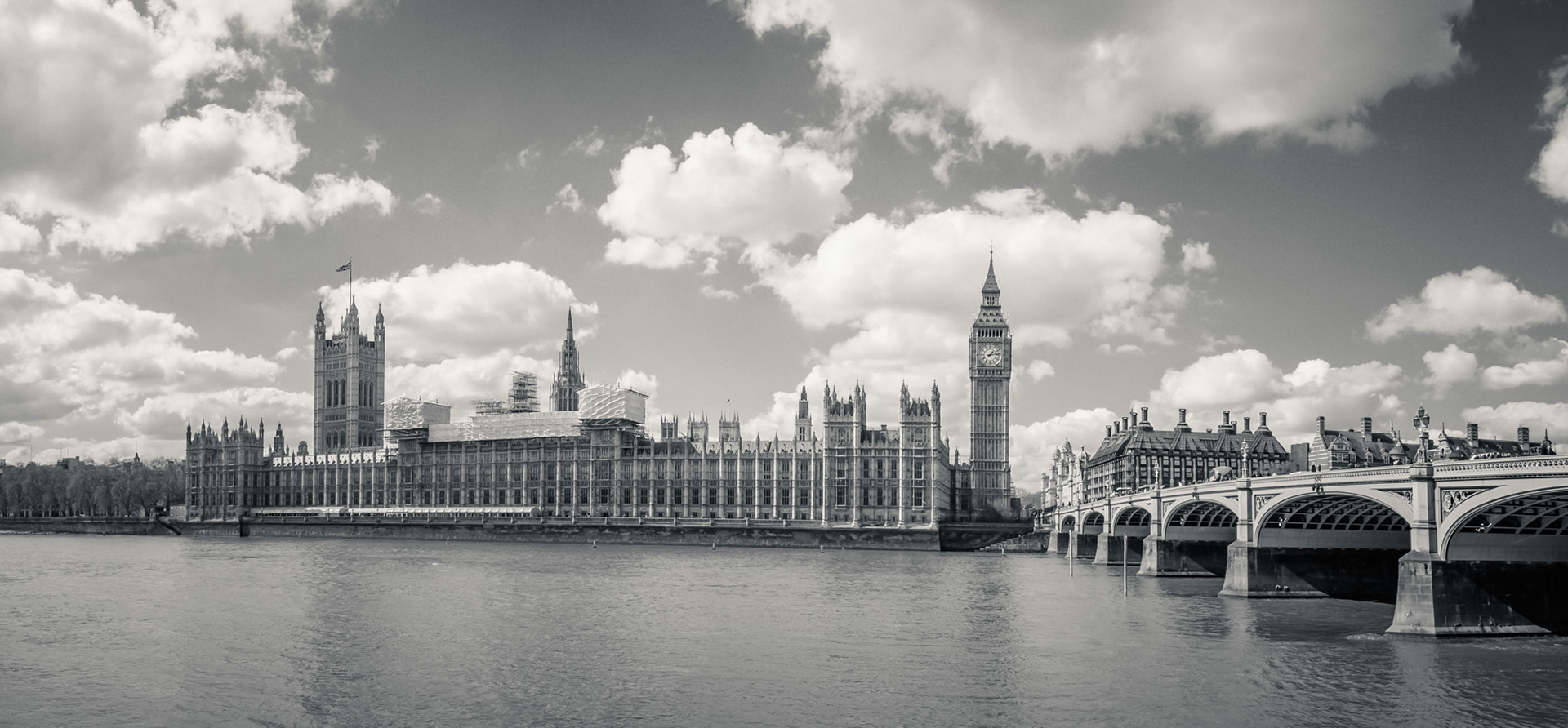 Big Ben, Parliament Building and Westminster Bridge. Realistic HDRI panorama monochrome